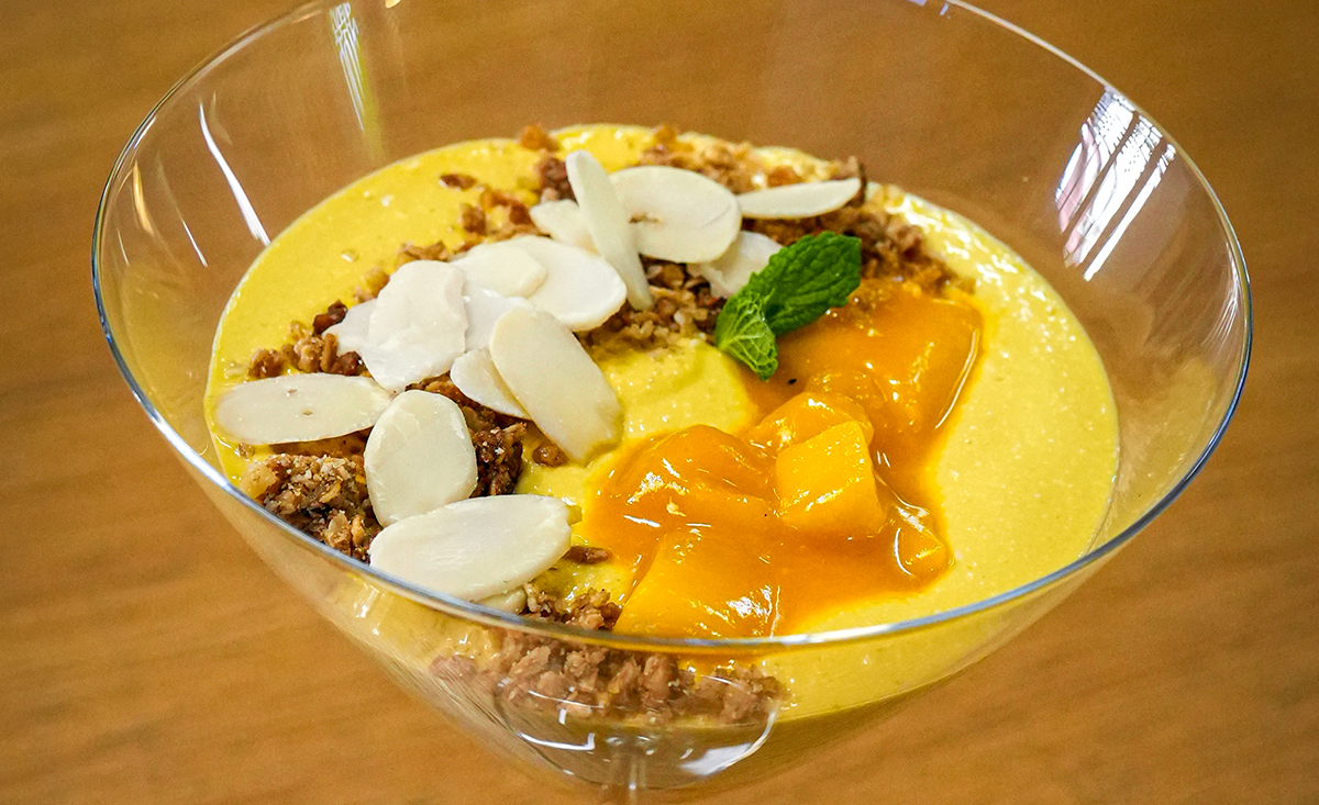 Întinde un strat subțire de piure de mango pe fundul bolului.